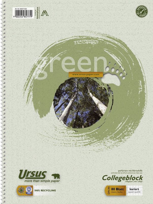 Notizblock, Größe A4, Ausführung kariert, Hersteller: Ursus more than simple paper, Herstellernummer: 608571020, EAN: 9002244857779, Collegeblock, 5mm kariert. 100 % Recyclingpapier, 60g, zertifiziert nach "Blauer Engel" und "Österreichisches Umweltzeichen"., Preis je Stück