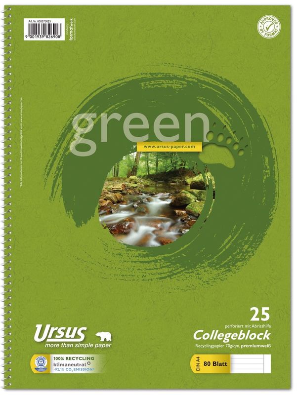 Ursus Green Collegeblock A4, 70g. Klimaneutrale Produktion: Einsatz von umweltschonenden Rohstoffen und CO2 neutralem Schreibpapier. 100 % Recycling mit hohem Weißegrad ohne optische Aufheller; Schreibpapier zertifiziert nach "Blauer Engel", "Österreichisches Umweltzeichen". Papierherstellungsprozess durch TÜV zertifiziert. , Hersteller: Ursus, Herstellernummer: 608575025, EAN: 9001939826908, Preis je Stück