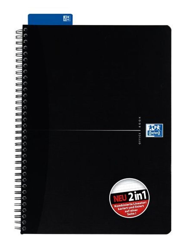 Collegeblock. Bindung (Art): Doppelspirale. 4fach-Lochung, Mikroperforation. Optik Paper 90 g/qm. Smart-Back, Deckblatt schwarz hochglänzend, Lineatur in violett, Lesezeichen-Lineal mit Motiv, abgerundete Ecken. Farbe: schwarz. Format: A4+. Lineatur: 5mm kariert und 7mm liniert. Blatt: 70.