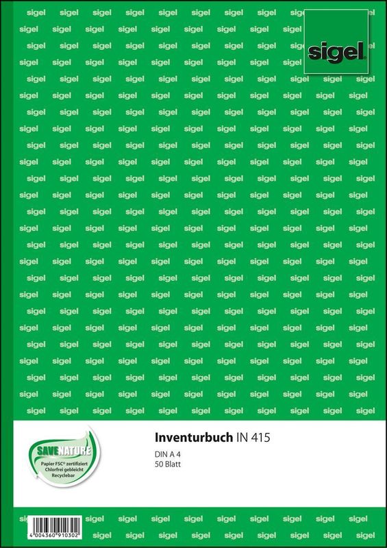 Inventurbuch, Größe A4, Hersteller: Sigel®, Herstellernummer: IN 415, EAN: 4004360910302, Formularbücher von Sigel garantieren durch ihre hohe Verarbeitungsqualität und Funktionalität einen maximalen Anwendernutzen. Die praktische Organisationshilfe für das Büro und im Alltag - damit es schneller und leichter geht. Mit lösungsmittelfreier Druckfarbe. MP = Microperforation. BL = Blaupapier. SD = selbstdurchschreibend., Preis je Stück