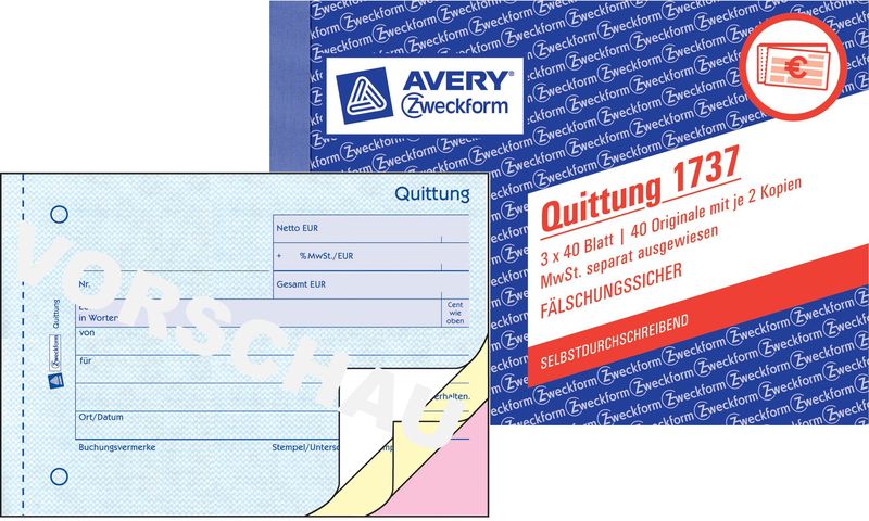 Buchhaltungs-, Kassenformular, Größe A6 quer, Hersteller: Avery Zweckform®, Herstellernummer: 1737, EAN: 4004182017371, Rechtssicher und stets nach aktuellem Gesetz gestaltet. Sicherheits-Bindung für starke Beanspruchung bis zum letzten Blatt. Mikroperforation für glatte Kanten und leichtes Heraustrennen. Farbige Durchschläge erleichtern die Organisation. Alle Formulare sind vorgelocht. MP = Mikroperforation. BL = Blaupapier. SD = selbstdurchschreibend., Preis je Stück