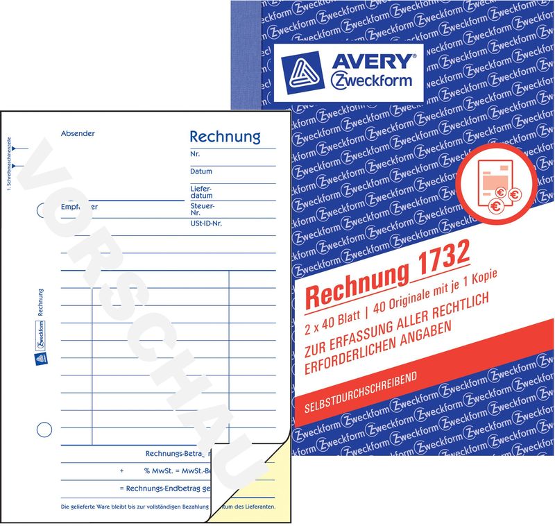 Buchhaltungs-, Kassenformular, Größe A6, Hersteller: Avery Zweckform®, Herstellernummer: 1732, EAN: 4004182017326, Rechtssicher und stets nach aktuellem Gesetz gestaltet. Sicherheits-Bindung für starke Beanspruchung bis zum letzten Blatt. Mikroperforation für glatte Kanten und leichtes Heraustrennen. Farbige Durchschläge erleichtern die Organisation. Alle Formulare sind vorgelocht. MP = Mikroperforation. BL = Blaupapier. SD = selbstdurchschreibend., Preis je Stück