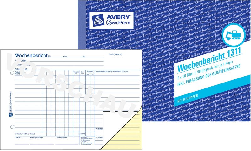 Bau- und Handwerksformular, Größe A5 quer, Hersteller: Avery Zweckform®, Herstellernummer: 1311, EAN: 4004182013113, Rechtssicher und stets nach aktuellem Gesetz gestaltet. Sicherheits-Bindung für starke Beanspruchung bis zum letzten Blatt. Mikroperforation für glatte Kanten und leichtes Heraustrennen. Farbige Durchschläge erleichtern die Organisation. Alle Formulare sind vorgelocht. MP = Mikroperforation. BL = Blaupapier. SD = selbstdurchschreibend., Preis je Stück