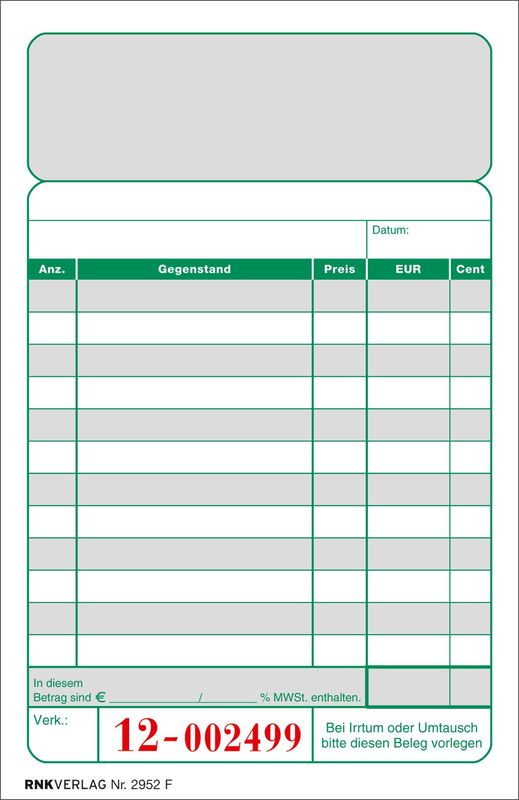 Buchhaltungs-, Kassenformular, Größe 100 x 150 mm, Hersteller: RNK Verlag, Herstellernummer: 2952 F, EAN: 4002871295215, Vordrucke und Formulare vom RNK-Verlag umfassen eine breite Auswahl von Standard- und außergewöhnlichen Lösungen für den gewerblichen und privaten Bedarf. Geprüfte Sicherheit bei allen Produkten durch aktive juristische Kontrolle und Beratung. MP = Mikroperforation. BL = Blaupapier. SD = selbstdurchschreibend., Preis je Stück