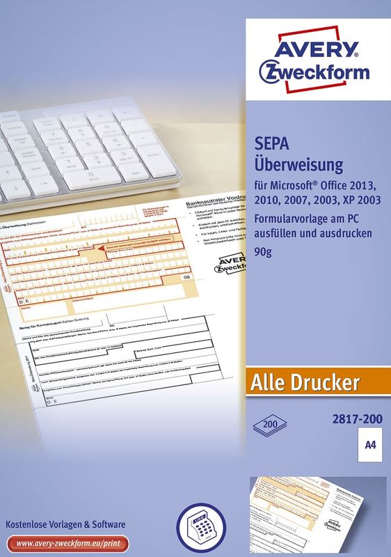 Der SEPA Überweisungsträger 2817-200 von AVERY ZWECKFORM im druckerfreundlichen DIN A4 Format kann bequem am PC ausgefüllt werden. Die 200 SEPA Überweisungsformulare in der Großpackung mit BIC und IBAN Feldern enthalten zudem einen automatischen Beleg für den Kontoinhaber und sind gemäß der "Richtlinien für einheitliche Zahlungsvordrucke" gestaltet. Die einzelnen Überweisungsträger sind mikroperforiert für ein einfaches Heraustrennen und glatte Ränder. Die Überweisungsformulare und Vordrucke von Avery Zweckform sind zuverlässige, bewährte Hilfen für Ihre Buchhaltung und werden regelmäßig auf Aktualität geprüft.