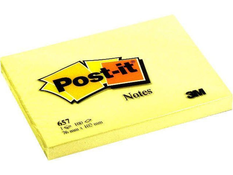 Haftnotiz, Größe (B x H) 102 x 76 mm, Hersteller: Post-it®, Herstellernummer: 657, EAN: 3134375014205, Das Original. Der Klassiker, der auf keinem Schreibtisch fehlen darf. Haften sicher auf Papier und allen glatten Oberflächen, sind rückstandsfrei ablösbar und haften immer wieder. Farbe: kanariengelb., Preis je Stück