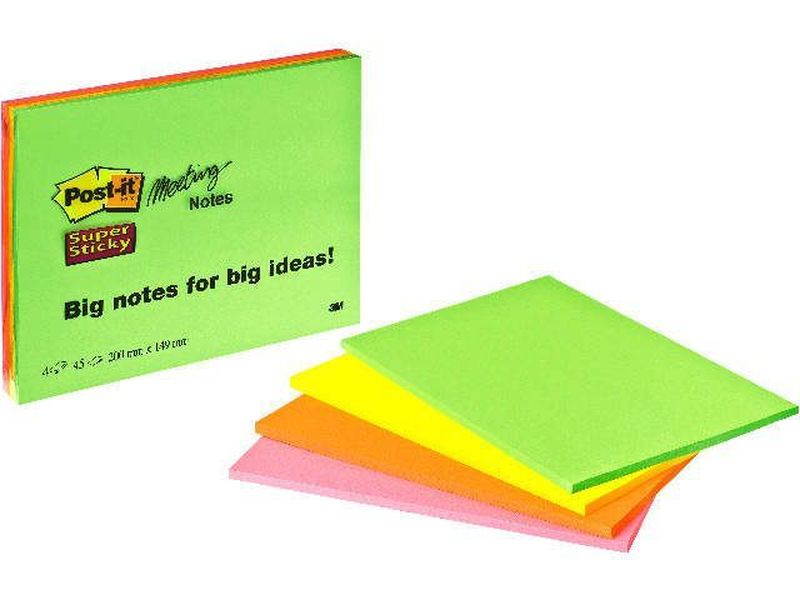 Haftnotiz, Größe (B x H) 200 x 149 mm, Farbe Neonfarben (sortiert), Hersteller: Post-it® MeetingNotes, Herstellernummer: 6845-SSP, EAN: 51131849693, Steigern Sie die Produktivität in Besprechungen, Brainstormings oder Seminaren durch selbsthaftende XXL-Haftnotizen- einfach und flexibel. Die Post-it® Meeting Notes lassen sich dank des besonders starken Post-it® Super Sticky Haftklebstoffes überall anbringen und immer wieder rückstandsfrei ablösen. Die extragroßen Haftnotizen haften auch an senkrechten und schwierigen Oberflächen, wie z.B. Fensterscheiben, Wänden oder Moderationstafeln. Sie sind signalstark, beschriftbar und leicht zu sortieren - für maximalen kreativen Freiraum! Neonfarben: grün, pink, orange und gelb., Preis je Packung