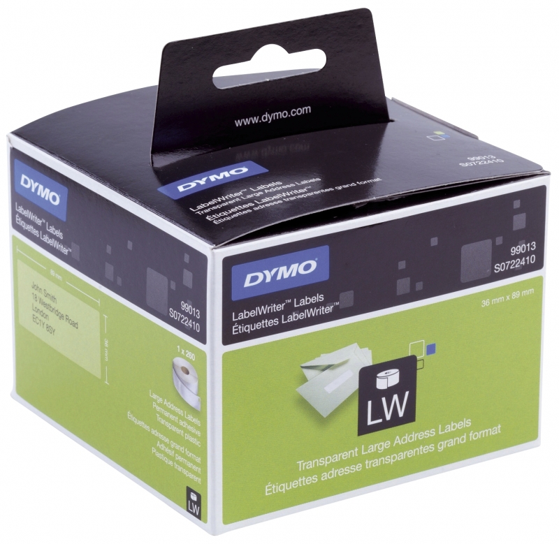 Kassette für Beschriftungsgerät Transparente Kunststoffetiketten, permanent haftend, Dymo-Code 99013, Bezeichnung Adress-Etiketten, Größe (B x H) mm 36 x 89, Etiketten/Rolle 260/1, Hersteller: DYMO®, Herstellernummer: S0722410, EAN: 5411313990134, Gestochen scharfe Etiketten - schnell und einfach. Der LabelWriter druckt mit einem direkten Thermodruck ohne Tinte, Farbband, Toner oder Tonerkartusche. Es gibt 16 verschiedene LabelWriter-Etikettenformate., Preis je Packung