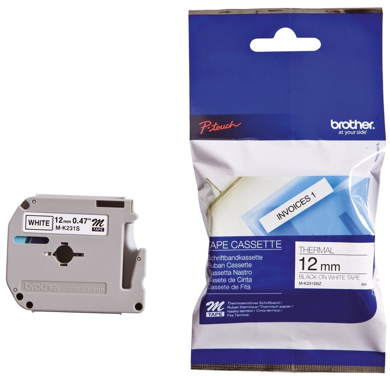 Kassette für Beschriftungsgerät Größe: 12 mm x 4 m (B x L), Schriftband schwarz auf weiß, Hersteller: Brother®, Herstellernummer: MK231SBZ, EAN: 4977766624985, Für Beschriftungsgeräte P-touch 55, 60, 65, 75, 80, 85, 90, 110, BB4 und mini'+ CHAR(39) +'tech., Preis je Stück