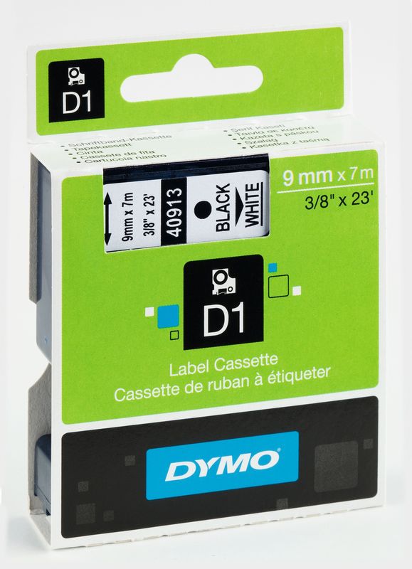 Kassette für Beschriftungsgerät Größe: 9 mm x 7 m (B x L), Dymo-Code 40913, Schriftband schwarz auf weiß, Hersteller: Dymo®, Herstellernummer: S0720680, EAN: 5411313409131, 6 mm breit für DYMO® 1000, 1000 plus, 2000, 5000, 5500, LabelManager 100 plus, 150, 200, 300, 350, 400, 450, LabelPointer 100, 200, 250, 300 und 350. 9/12/19 mm breit für DYMO® Pocket, 1000, 1000 plus, 2000, 3500, 4500, 5000, 5500, LabelManager 100, 100 plus, 120P, 150, 200, 210D, 260P, 300, 360D, 400, 450D, PC, LabelPoint 100, 150, 200, 250, 300 und 350. 24 mm breit für DYMO® LabelManager 300, 400, LabelManager PCH und LabelWriter 400 DUO und PC., Preis je Stück
