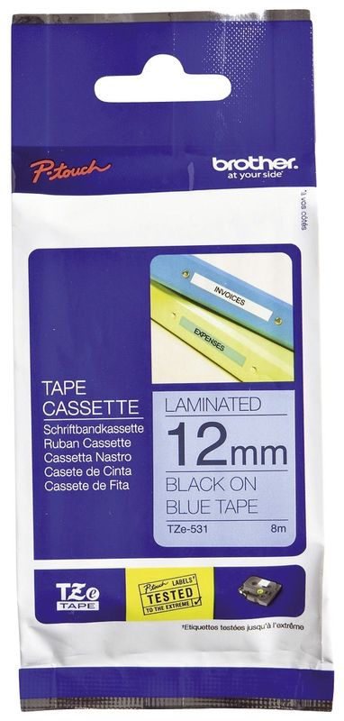 Kassette für Beschriftungsgerät Größe: 12 mm x 8 m (B x L), Schriftband schwarz auf blau, Hersteller: Brother®, Herstellernummer: TZ531, EAN: 4977766052085, Preis je Stück