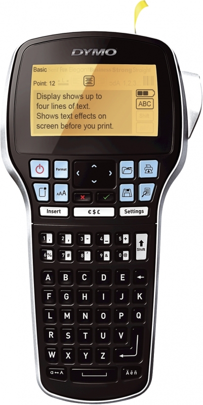 Beschriftungsgerät zum Erstellen von 6, 9, 12 und 19 mm breiten D1-Etiketten. Großes 4-zeiliges Display mit Hintergrundbeleuchtung. Schnelle Auswahl von Beschriftungsfunktionen. 8 Schriftarten, 7 Schriftgrößen, 10 Schriftstile. Text geben Sie mit der gewohnten ABC-Tastatur ein, und es stehen Spezialfunktionstasten für Satzzeichen, Währungs- und andere Sonderzeichen zur Verfügung. Mehrfachdruck, fortlaufende Nummerierung. Vorgabe der Etikettenlänge, manueller Bandabschneider. Batterie- oder Netzbetrieb. Lieferumfang: LabelManager 420P, Litihum-Ionen-Akkusatz, Netzteil, inkl. 4 D1-Etiketten: 6mm schwarz auf transparent, 9mm schwarz auf gelb, 12mm schwarz auf weiß, 19mm schwarz auf rot.