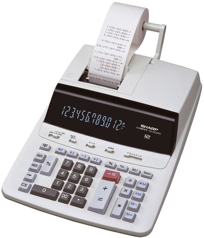 12-stelliges Display blau (17 mm), 2 Speicher (M und I), Währungsumrechnung, Steuerberechnung (Auf- und Abschlag), Zwischensummenfunktion, Postenzähler, 1000er Unterteilung, 00-Taste, Runden: Auf, Ab, 5/4. Druckgeschwindigkeit: 4,3 Zeilen/Sekunde, 2 Druckfaben, Farbband Gr. 51, Speicherschutzbatterie, mit fixem Stromanschluss, Lieferung mit Netzteil. Papierrolle BxØxHülse: 57x66x12mm. Größe BxHxT: 250 x 345 x 87 mm.; EAN: 4974019819914; Herstellernummer: CS2635RHGYSE