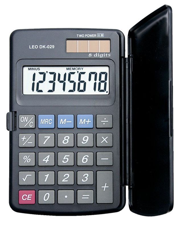 Taschenrechner, Anzeige 8-stellig, Hersteller: LEO®, Herstellernummer: LEO DK-029, EAN: 4016596040524, Großes LC-Display. Speicher, Prozentrechnung, Quadratwurzelfunktion. Für Linkshänder geeignet. Solar- und Batteriebetrieb. Mit Hard Cover. Größe BxHxT: 70 x 11,5 x 180 mm., Preis je Stück