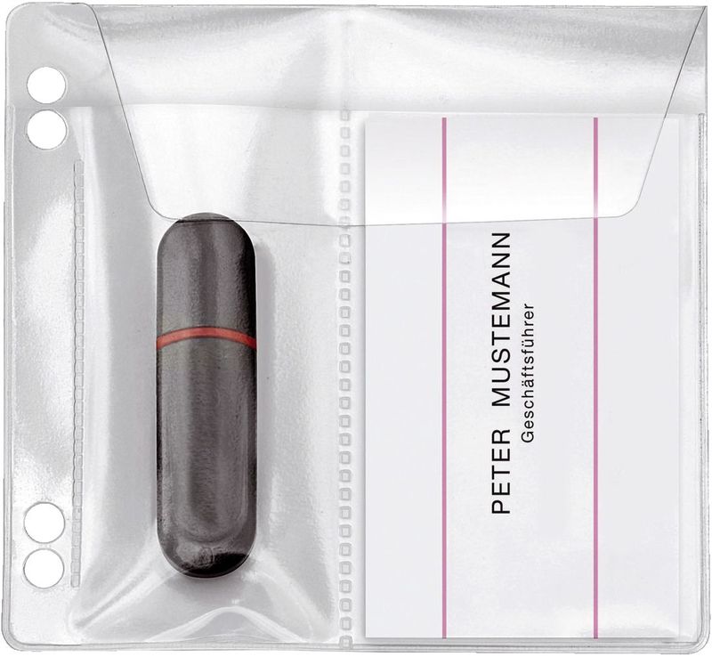 Hülle zum Abheften, mit Verschlussklappe und seitlichem Abheftrand mit Lochung zum Abheften im Ordner. Für 2 USB-Sticks oder 1 USB-Stick und 1 Visitenkarte oder Speicherkarte. Material PVC-Folie. Maße: 100 x 100 mm. ; Farbe transparent; Packung mit 5 Stück; Preis pro Packung; Herrsteller-Nr.: 4377010; EAN: 4000225048937