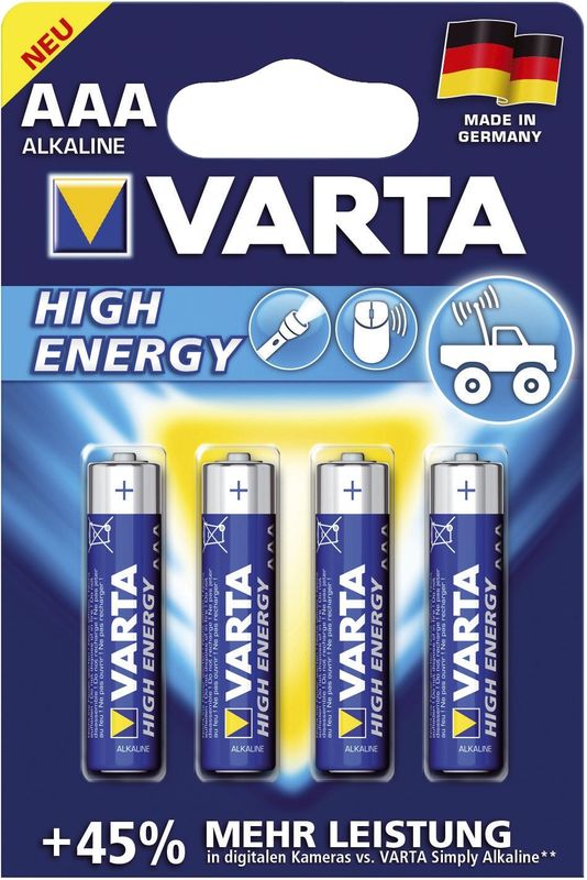 Gerätebatterie (nicht klassifiziert), Typ/Spannung Micro/LR03/AAA, 1,5 V, Packung mit 4 Stück, Hersteller: Varta, Herstellernummer: 04903 121 414, EAN: 4008496559749, Hochleistungsbatterie, quecksilber- und cadmiumfrei. Besonders geeignet für motorgetriebene Geräte mit hohem Strombedarf, wie Spielzeuge, Audiogeräte, Elektronikspiele usw., Preis je Packung