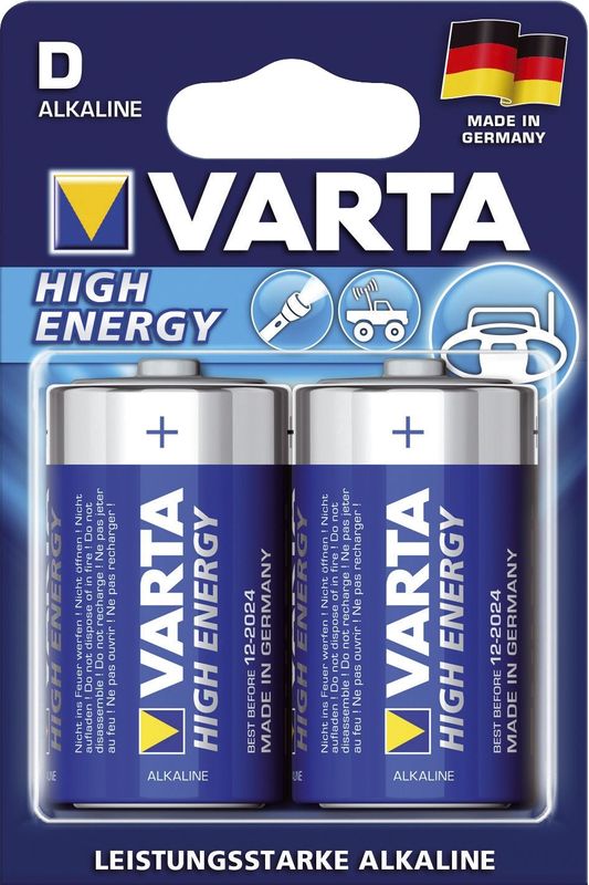 Gerätebatterie (nicht klassifiziert), Typ/Spannung Mono/LR20/D, 1,5 V, Packung mit 2 Stück, Hersteller: Varta, Herstellernummer: 04920 121 412, EAN: 4008496559237, Hochleistungsbatterie, quecksilber- und cadmiumfrei. Besonders geeignet für motorgetriebene Geräte mit hohem Strombedarf, wie Spielzeuge, Audiogeräte, Elektronikspiele usw., Preis je Packung