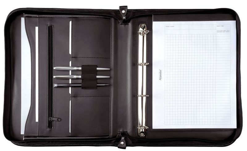 Ringbuchmappe mit herausnehmbarer 4-Ring-Mechanik, Ring-Ø 20mm, diversen Innenfächern und einem Außenfach mit Reißverschluss. Umlaufender Reißverschluss. Aus echtem Leder. Für DIN A4. Größe: 360 x 40 x 285 mm. Lieferung ohne Inhalt., Hersteller: Alassio®, Herstellernummer: 30043, EAN: 4021068300433, Preis je Stück