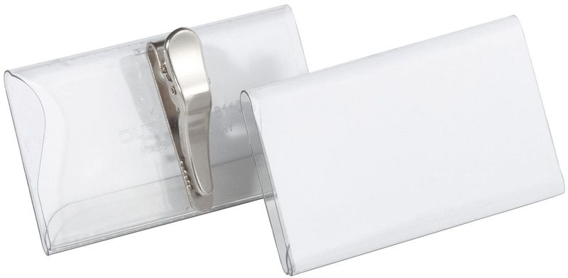 Namensschild Größe (B x H) 75 x 40 mm, Packung mit 25 Stück, Hersteller: Durable, Herstellernummer: 8110-19, EAN: 4005546811208, Mit drehbarer Krokoklemme und auswechselbarem Blanko-Einsteckschild. Seitliches Anbringen am Revers möglich. Aus transparenter Hartfolie., Preis je Packung