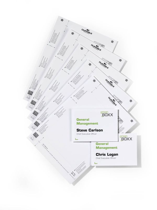 Türschilder INFO SIGN Einsteckschilder, auf A4-Bogen, PG mit 10 Blatt Größe (B x H) 149 x 105,5 mm, Inhalt 20 Schilder, Hersteller: Durable, Herstellernummer: 4851-02, EAN: 4005546400778, Türschild in Rippenoptik mit 2 versetzten, schwarzen Befestigungskappen. Die Kartoneinlage ist durch eine nicht spiegelnde Acrylplatte geschützt. Der hochwertige Aluminiumrücken kann an dem gewünschten Objekt mit dem beiliegenden Montageset verschraubt oder verklebt werden. Farbe: metallic silber., Preis je Packung