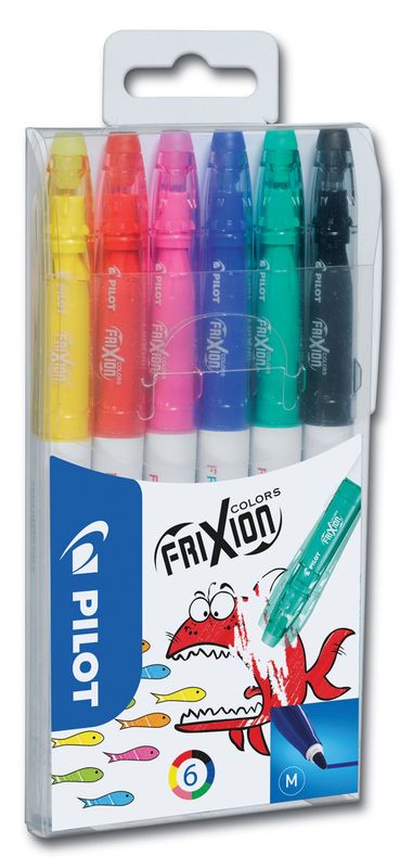 Faserstift FriXion Colors. Material des Schaftes: Kunststoff. Farbe des Schaftes: weiß. Ausführung: formstabile Polyester Faserspitze. Art der Schreibflüssigkeit: thermosensitive Tinte, löschbar. Wärme (ca. 60°C) lässt das Gemalte verschwinden, Kälte (ca. - 10°C) bringt den Umkehreffekt, das Gemalte kommt wieder. Strichstärke: 0,4 mm. Schreibfarbe von Schreibgeräten: 6 Farben. Ausführung des Inhalts mit Packung: 6 Farben im Etui.