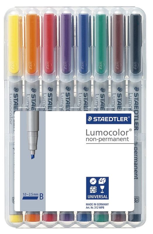 Universalstift Lumocolor® , non-permanent Strichstärke ca. 1,0 oder 2,5 mm (B) Schreibfarbe Box mit 8 Farben, Hersteller: Staedtler®, Herstellernummer: 312 WP8, EAN: 4007817323403, Der Universalstift, der nicht austrocknet! Nachfüllbarer Universalstift für Overhead-Projektion und fast alle Flächen. Feucht abwischbar von Folien. Schnell trocknend. Wasserlösliche Tinte mit höchster Farbbrillanz. Kappe und Abschluss in Schreibfarbe. Schaftfarbe: grau. Airplane-safe ? automatischer Druckausgleich verhindert das Auslaufen des Stiftes im Flugzeug. Farben 4er STAEDTLER Box: blau, grün, rot, schwarz. Farben 6er STAEDTLER Box: blau, braun, grün, orange, rot, schwarz. Farben 8er STAEDTLER Box: blau, braun, gelb, grün, orange, rot, schwarz, violett., Preis je Packung