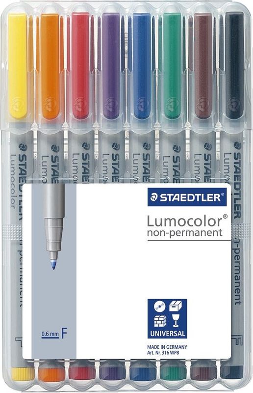 Universalstift Lumocolor® , non-permanent Strichstärke ca. 0,6 mm (F) Schreibfarbe Box mit 8 Farben, Hersteller: Staedtler®, Herstellernummer: 316 WP8, EAN: 4007817323601, Der Universalstift, der nicht austrocknet! Nachfüllbarer Universalstift für Overhead-Projektion und fast alle Flächen. Feucht abwischbar von Folien. Schnell trocknend. Wasserlösliche Tinte mit höchster Farbbrillanz. Kappe und Abschluss in Schreibfarbe. Schaftfarbe: grau. Airplane-safe ? automatischer Druckausgleich verhindert das Auslaufen des Stiftes im Flugzeug. Farben 4er STAEDTLER Box: blau, grün, rot, schwarz. Farben 6er STAEDTLER Box: blau, braun, grün, orange, rot, schwarz. Farben 8er STAEDTLER Box: blau, braun, gelb, grün, orange, rot, schwarz, violett., Preis je Packung