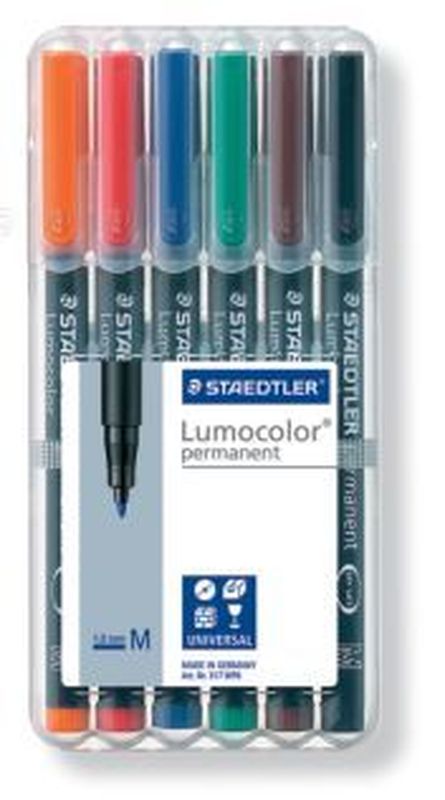 Universalstift Lumocolor®, permanent Strichstärke ca. 1 mm (M) Schreibfarbe Box mit 6 Farben, Hersteller: Staedtler®, Herstellernummer: 317 WP6, EAN: 4007817310410, Der Universalstift, der nicht austrocknet! Nachfüllbarer Universalstift für Overhead-Projektion und fast alle Flächen. DRY SAFE: kann tagelang offen liegen, ohne einzutrocknen. Airplane-safe ? automatischer Druckausgleich verhindert das Auslaufen des Stiftes im Flugzeug. Hervorragend wisch- und wasserfest auf fast allen Flächen. Sekundenschnell trocken, daher ideal für Linkshänder. Geruchsarme, Xylol - toluolfreie Tinte mit höchster Farbbrillanz. Kappe und Abschluss in Schreibfarbe. Schaftfarbe: schwarz. Farben 4er STAEDTLER Box: blau, grün, rot, schwarz. Farben 6er STAEDTLER Box: blau, braun, grün, orange, rot, schwarz. Farben 8er STAEDTLER Box: blau, braun, gelb, grün, orange, rot, schwarz, violett., Preis je Packung