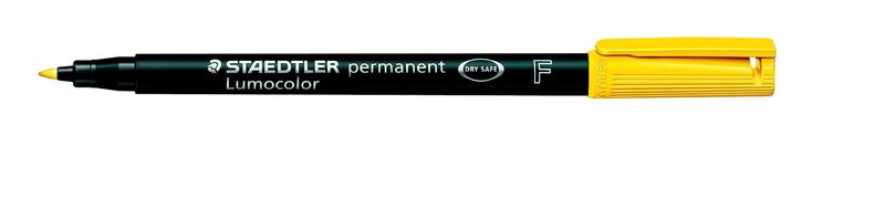 Universalstift Lumocolor®, permanent Strichstärke ca. 0,6 mm (F) Schreibfarbe gelb, Hersteller: Staedtler®, Herstellernummer: 318-1, EAN: 4007817332238, Der Universalstift, der nicht austrocknet! Nachfüllbarer Universalstift für Overhead-Projektion und fast alle Flächen. DRY SAFE: kann tagelang offen liegen, ohne einzutrocknen. Airplane-safe ? automatischer Druckausgleich verhindert das Auslaufen des Stiftes im Flugzeug. Hervorragend wisch- und wasserfest auf fast allen Flächen. Sekundenschnell trocken, daher ideal für Linkshänder. Geruchsarme, Xylol - toluolfreie Tinte mit höchster Farbbrillanz. Kappe und Abschluss in Schreibfarbe. Schaftfarbe: schwarz. Farben 4er STAEDTLER Box: blau, grün, rot, schwarz. Farben 6er STAEDTLER Box: blau, braun, grün, orange, rot, schwarz. Farben 8er STAEDTLER Box: blau, braun, gelb, grün, orange, rot, schwarz, violett., Preis je Stück