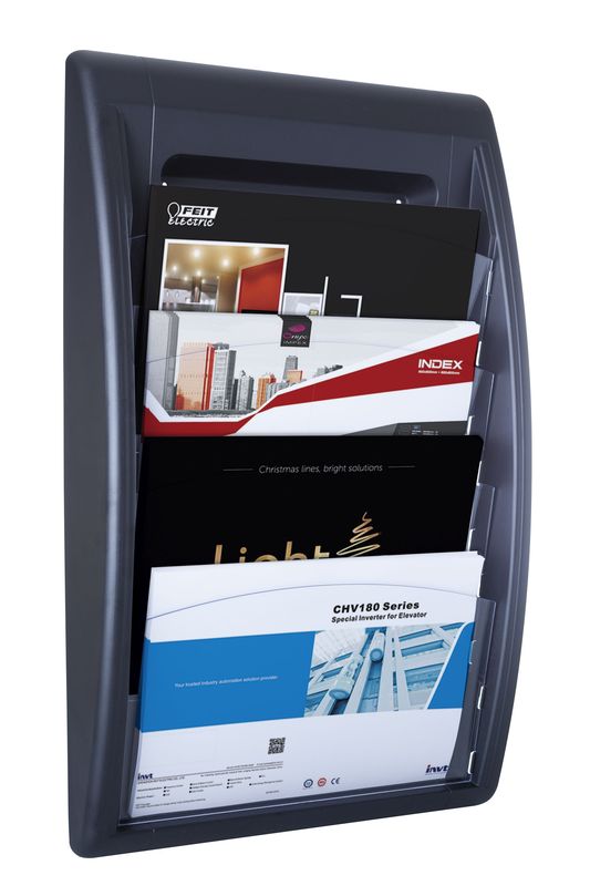 Wand-Prospekthalter aus Polystyrol für Kataloge, Prospekte usw. Transparente Sichtfenster erlauben Vollansicht der Dokumente. Kominierbar zu den kompletten Wandregalen. Einfache Wandmontage (Schrauben nicht im Lieferumfang).