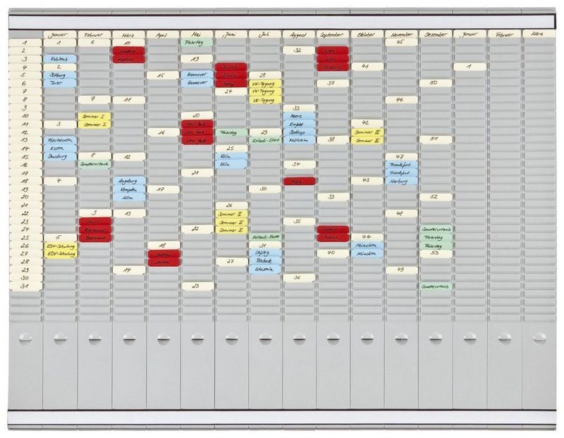 T-Kartentafel, Streifenplaner Größe (B x H) 99,2 x 78,3 cm, Hersteller: Franken, Herstellernummer: PV1015, EAN: 4016946080583, Aktuelle Jahresübersicht + Vorplanung über 3 Monate! Ideal für Terminplanung, Aufgaben- und Projektübersicht. Am oberen Rand der Steckkarte bleibt die Hauptinformation sichtbar. Der Kartenrumpf bietet viel Platz für alle wichtigen Zusatzinformationen. Von den 16 Modulen mit je 35 Schlitzen (Kartengröße 2) dienen 12 als Jahresplaner und 3 Module als Vorplanung für das nächste Jahr. 1 Modul wird am Anfang der Tafel als Indexspalte eingesetzt. In dieser werden die Tage 1-31 oder die Projekte für bis zu 35 Positionen mit T-Karten gekennzeichnet. Die obersten Schlitze der Module können zur Einteilung in die einzelnen Monate genutzt werden. Mit den leicht austauschbaren T-Karten bleiben Sie auch in einem verschobenen Geschäftsjahr flexibel. Inklusive 16 Kartenträger mit je 35 Schlitzen (Kartengröße 2), 1 Satz Verbindungsprofile, 500 T-Karten Größe 2, je 100 Stück in cremeweiß, rot, gelb, grün und blau. Inklusive Montageset und -anleitung., Preis je Stück