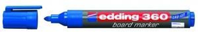 Board-Marker Schreibfarbe blau, Hersteller: Edding, Herstellernummer: 4-360003, EAN: 4004764391271, Nachfüllbarer Marker für Whiteboards und fast alle geschlossenen Oberflächen. Rundspitze, Strichstärke ca. 1,5 ? 3 mm. Die Cap-off-Tusche verhindert ein Austrocknen, selbst wenn der Marker einige Tage ohne Kappe liegen bleibt. Geruchsarme Pigmenttusche, trocken abwischbar, ohne Zusatz von Butylacetat. Einfach und sauber nachfüllbar mit edding BTK25 Nachfülltusche. Auswechselbare Spitze., Preis je Stück