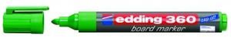 Board-Marker Schreibfarbe grün, Hersteller: Edding, Herstellernummer: 4-360004, EAN: 4004764391288, Nachfüllbarer Marker für Whiteboards und fast alle geschlossenen Oberflächen. Rundspitze, Strichstärke ca. 1,5 ? 3 mm. Die Cap-off-Tusche verhindert ein Austrocknen, selbst wenn der Marker einige Tage ohne Kappe liegen bleibt. Geruchsarme Pigmenttusche, trocken abwischbar, ohne Zusatz von Butylacetat. Einfach und sauber nachfüllbar mit edding BTK25 Nachfülltusche. Auswechselbare Spitze., Preis je Stück