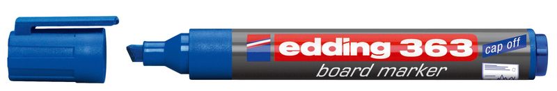 Whiteboard-Marker 363 / 365 Marker 363, Keilspitze, ca. 1 - 5 mm Schreibfarbe blau, Hersteller: Edding, Herstellernummer: 4-363003, EAN: 4004764000364, Nachfüllbarer Marker für Whiteboards und fast alle geschlossenen Oberflächen. Die Cap-off-Tusche verhindert ein Austrocknen, selbst wenn der Marker einige Tage ohne Kappe liegen bleibt. Geruchsarme Pigmenttusche, trocken abwischbar, ohne Zusatz von Butylacetat. Einfach und sauber nachfüllbar mit edding BTK25 Nachfülltusche. Auswechselbare Spitze., Preis je Stück