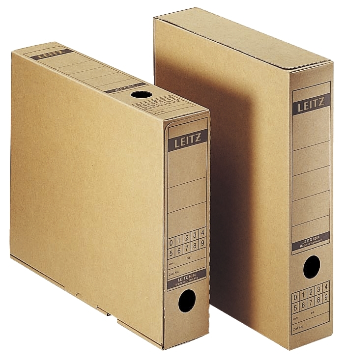 Archivablage, Farbe naturbraun, Hersteller: Leitz, Herstellernummer: 6085-00-00, EAN: 4002432312412, Allseitig geschlossen. Griffloch und Archivdruck für Hoch- und Querformat. Buchförmig aufklappbar. Aus Wellpappe (RC), mit Natronpapier kaschiert. Für A3. Größe: 70 x 437 x 325 mm (BxHxT). Flachliegend verpackt., Preis je Stück