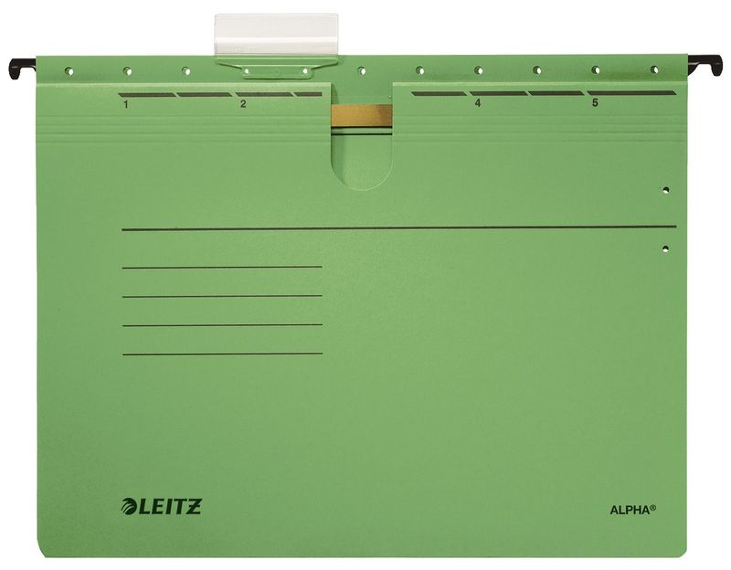 Leitz Hängehefter ALPHA®, für kaufmännische Heftung. Für die geheftete Ablage von Einzelakten. Mit Daumenausschnitt und fest eingezacktem Aufreihband, Hängeschiene mit kunststoffumsinterten Hängenasen, Vollsichtreiter und auswechselbaren Blanko-Schildchen. Material: 100% Recyclingkarton-Karton 275 g/qm (RC). Für A4. Farbe: grün.