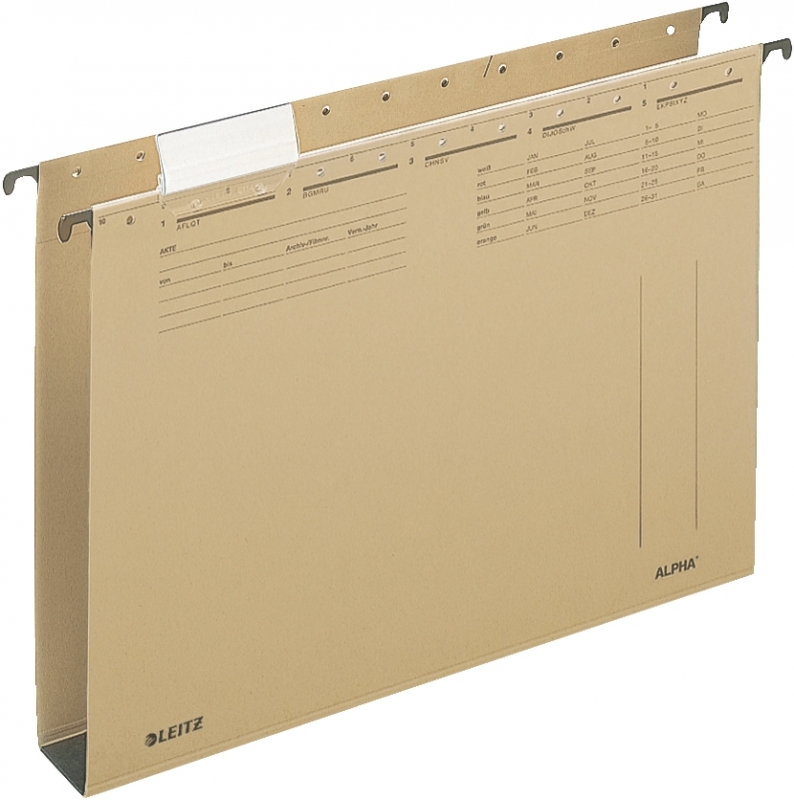 ALPHA® Hängesammler mit Hartpappeboden, Bodenbreite 40 mm, Hersteller: Leitz, Herstellernummer: 1947-00-00, EAN: 4002432407125, Seitlich offen. Kunststoffumsinterte Hängeschienen, Vollsichtreiter und auswechselbare Blanko-Schildchen. Schlitzstanzung für Einsteck-Heftstreifen. Aus 320 g/qm Natronkarton (RC). Für A4. Farbe: naturbraun., Preis je Stück