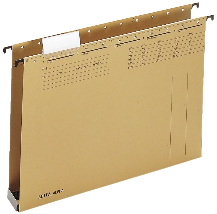 ALPHA® Hängesammler mit Kunststoffboden, Bodenbreite 40 mm, Hersteller: Leitz, Herstellernummer: 1942-00-00, EAN: 4002432303717, Seitlich offen, mit Seitenbegrenzung. Kunststoffumsinterte Hängeschienen, Vollsichtreiter und auswechselbare Blanko-Schildchen. Schlitzstanzung für Einsteck-Heftstreifen. Für A4. Farbe: naturbraun., Preis je Stück