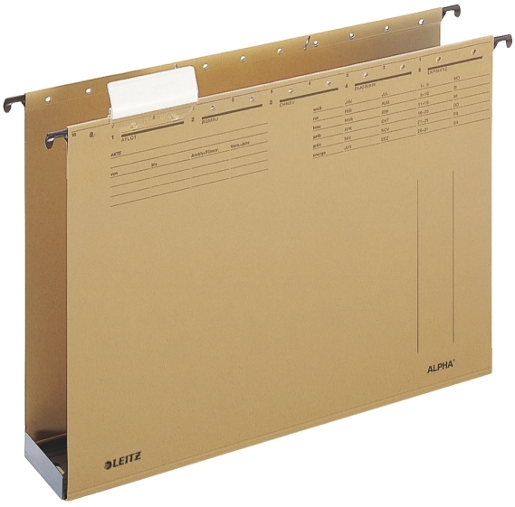 ALPHA® Hängesammler mit Kunststoffboden, Bodenbreite 60 mm, Hersteller: Leitz, Herstellernummer: 1941-00-00, EAN: 4002432303700, Seitlich offen, mit Seitenbegrenzung. Kunststoffumsinterte Hängeschienen, Vollsichtreiter und auswechselbare Blanko-Schildchen. Schlitzstanzung für Einsteck-Heftstreifen. Für A4. Farbe: naturbraun., Preis je Stück