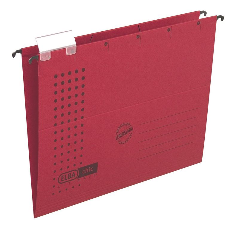 Exklusiver 240 g/qm starker Canson Karton verhindert das Ausreißen des Kartons bei intensivem Gebrauch. Für Lose-Blatt-Ablage, seitlich offen. Komfort-Sichtreiter mit aufklappbarer Rückwand und auswechselbarem Beschriftungsschildchen. Schlitzstanzung für Einhängeheftstreifen 27 592. Extrem steife Metallhängeschienen mit pulverbeschichteten Enden. Für ca. 330 Blatt., Hersteller: Elba, Herstellernummer: 85801 RO, EAN: 4002030851399, Preis je Packung