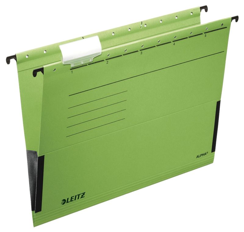 Leitz Hängetasche ALPHA®, seitlich mit Fröschen verschlossen. Für Loseblatt-Ablage von Einzelakten. Mit Schlitzstanzung für Einsteckheftstreifen (6130), Hängeschiene mit kunststoffumsinterten Hängenasen, Vollsichtreiter und auswechselbaren Blanko-Schildchen. Mit Falzungen für eine individuelle Einstellung auf die Inhaltsmenge. Material: 100% Recyclingkarton 275 g/qm (RC). Für A4. Farbe: grün.