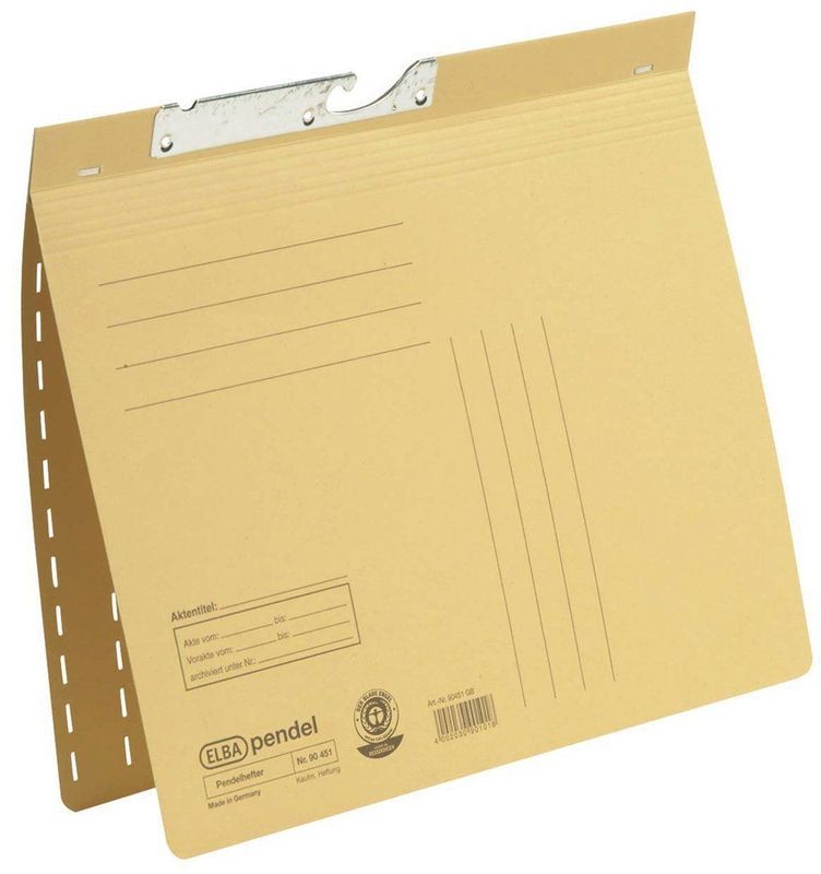 Pendelhefter, kfm. Heftung aus 250 g/qm Manilakarton (RC), Farbe gelb, Hersteller: Elba, Herstellernummer: 90 451 GB, EAN: 4002030901018, Für kaufmännische Heftung. Mit Lochstanzung für Stecksignale im Hinterflügel und Metallhängebeschlag. Organisationsaufdruck. Für ca. 200 DIN A4-Blätter. Für DIN A4. Größe: 318 x 265 mm., Preis je Stück