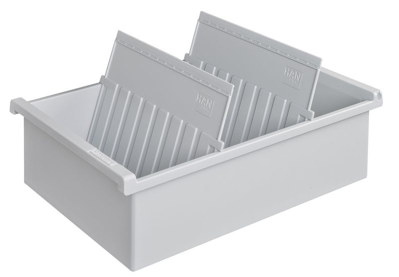 Karteitröge für ca. 1300 Karteikarten, inkl. 2 Stützplatten + Sichtreiter, für Karten A5 quer, Größe (B x T x H) 228x320x96 mm, Hersteller: HAN, Herstellernummer: 955-0-11, EAN: 4012473955011, Der Trog ist in die Schreibtischschublade einstellbar. Möbelschonende Gummifüßchen. Aus hochwertigem, schwermetallfreien Kunststoff. Farbe: lichtgrau., Preis je Stück