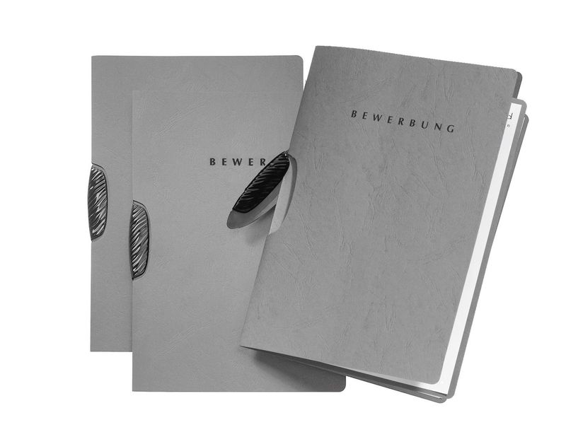 Klemmmappe aus hochwertigem Karton mit Kunststoffklemme und silbernem Schriftzug "Bewerbung" auf dem Vorderdeckel. Für bis zu 10 Blatt A4.