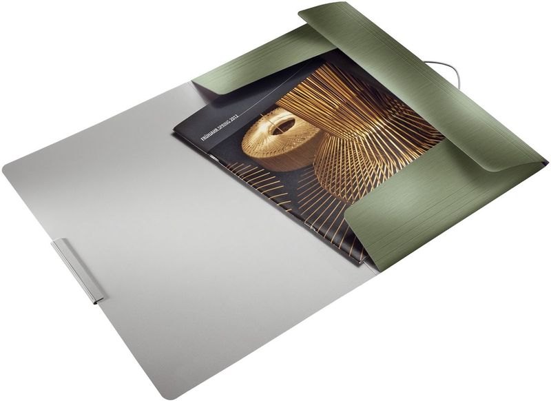 Leitz Eckspannermappe Style mit 3 Klappen am Unterdeckel. Edelstahlbeschichteter Verschluss mit Gummizug, mit soft gebürsteter Oberfläche. Material: Polyproplyen (PP). Für bis zu 150 Blatt. Format: A4, 320 x 235 mm. Farbe: seladon grün.