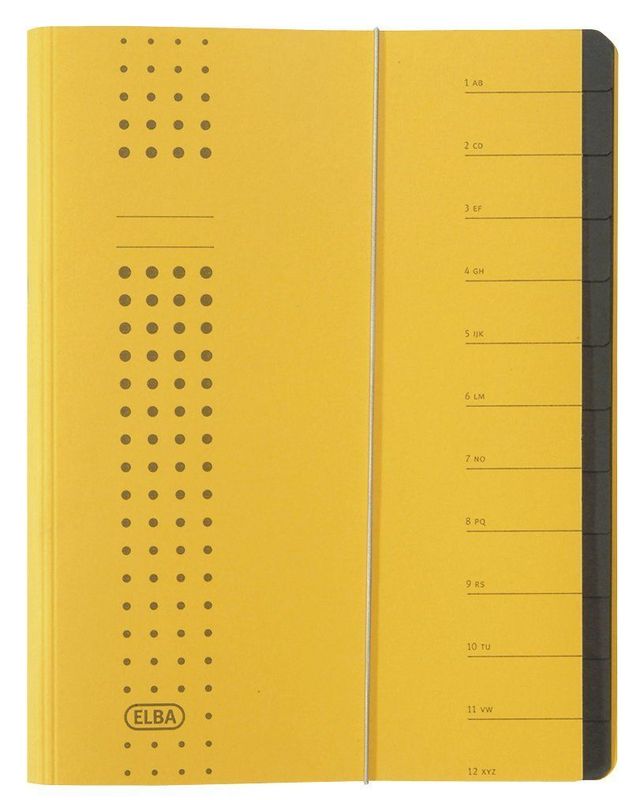 Ordnungsmappen chic, Farbe gelb, Hersteller: Elba, Herstellernummer: 42 496 GB, EAN: 4002030421059, Fächer mit Blankotaben. Vorderdeckel mit Tabaufdruck und Feineinteilungen zum Beschriften. Sicherung durch Spanngummi. Aus 450 g/qm Karton (RC). Für DIN A4, Größe: 250 x 315 mm., Preis je Stück