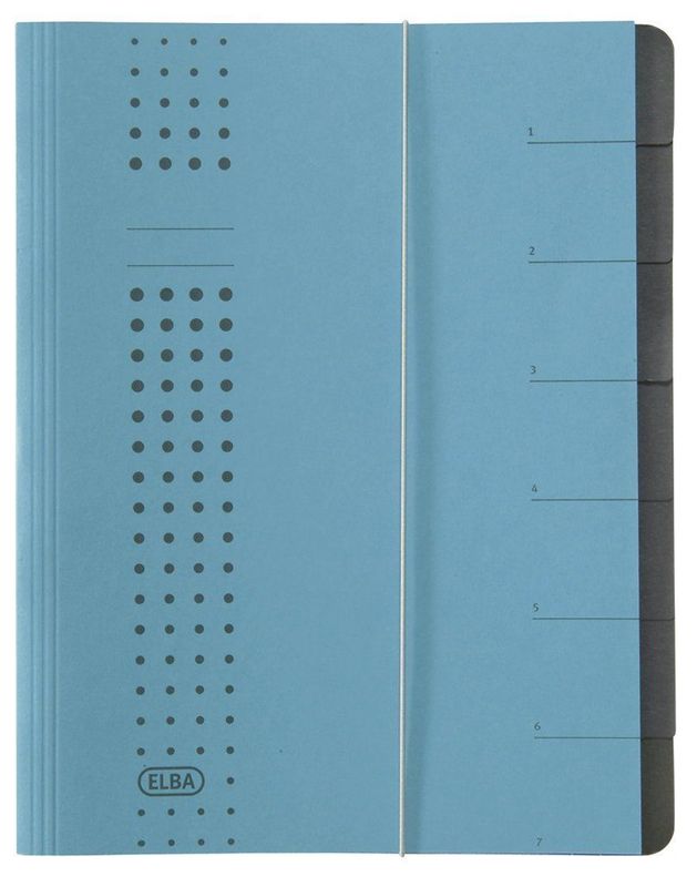 Ordnungsmappen chic, Farbe blau, Hersteller: Elba, Herstellernummer: 42 495 BL, EAN: 4002030421004, Fächer mit Blankotaben. Vorderdeckel mit Tabaufdruck und Feineinteilungen zum Beschriften. Sicherung durch Spanngummi. Aus 450 g/qm Karton (RC). Für DIN A4, Größe: 250 x 315 mm., Preis je Stück