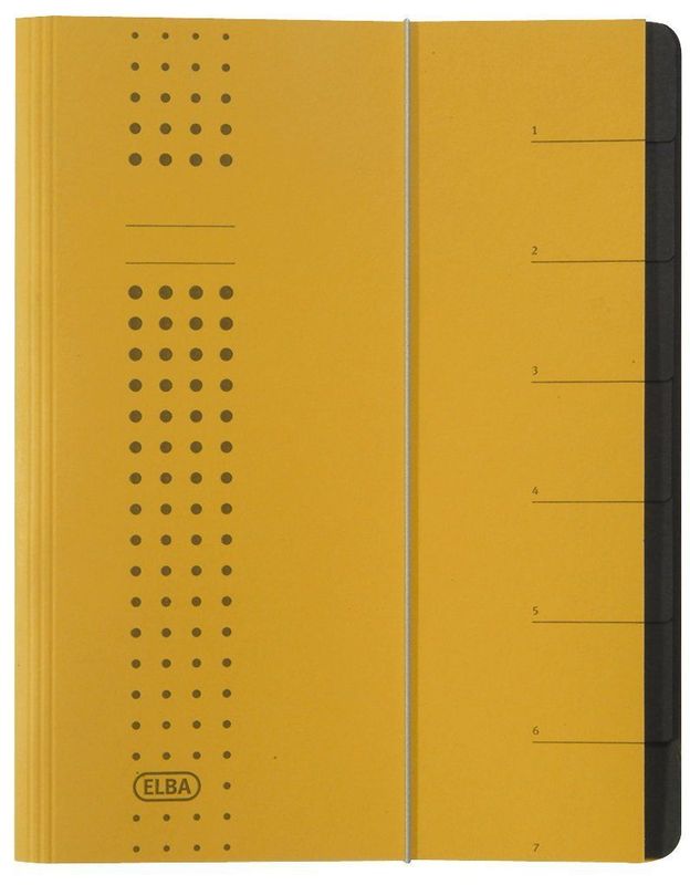 Ordnungsmappen chic, Farbe gelb, Hersteller: Elba, Herstellernummer: 42 495 GB, EAN: 4002030421011, Fächer mit Blankotaben. Vorderdeckel mit Tabaufdruck und Feineinteilungen zum Beschriften. Sicherung durch Spanngummi. Aus 450 g/qm Karton (RC). Für DIN A4, Größe: 250 x 315 mm., Preis je Stück