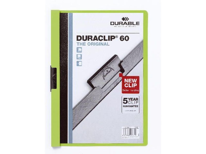 Klemm-Mappen DURACLIP® Original für bis zu 60 Blatt A4, Größe: 220x307 mm, Farbe grün, Hersteller: Durable, Herstellernummer: 2209-05, EAN: 4005546210612, Klemm-Mappe mit stabiler, flacher, schwarzer Metallklemme aus Spezialstahl. Transparenter Vorderdeckel und farbiger Rückdeckel aus Hartfolie. 5 Jahre Garantie des Hersteller auf den Clip., Preis je Stück