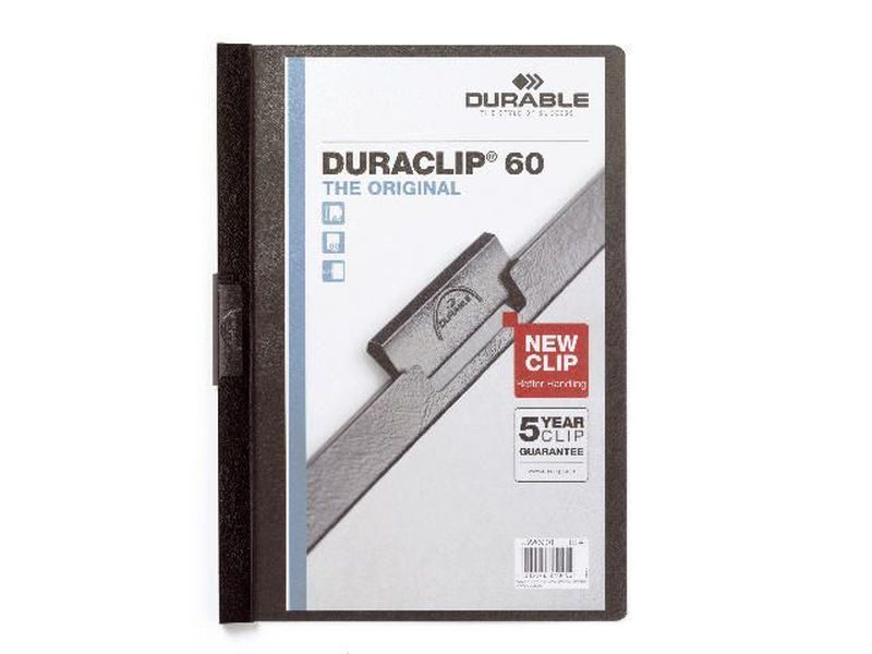 Klemm-Mappen DURACLIP® Original für bis zu 60 Blatt A4, Größe: 220x307 mm, Farbe schwarz, Hersteller: Durable, Herstellernummer: 2209-01, EAN: 4005546210452, Klemm-Mappe mit stabiler, flacher, schwarzer Metallklemme aus Spezialstahl. Transparenter Vorderdeckel und farbiger Rückdeckel aus Hartfolie. 5 Jahre Garantie des Hersteller auf den Clip., Preis je Stück